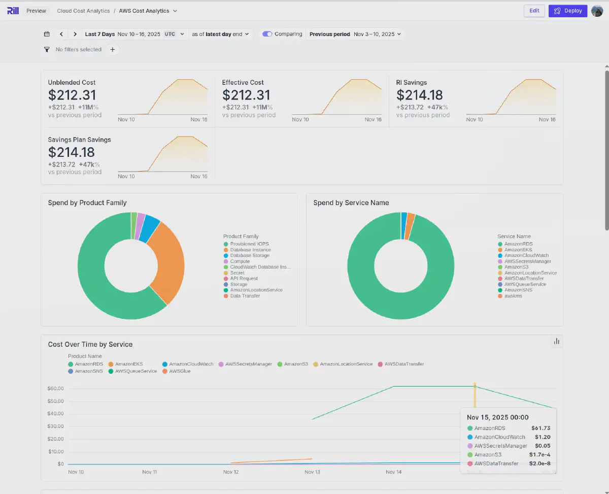 This solution is composable—dlt can ingest multi-cloud data and Rill can add any sources. The reports show a single pane of glass across multiple cost sources. See the dashboard examples below.