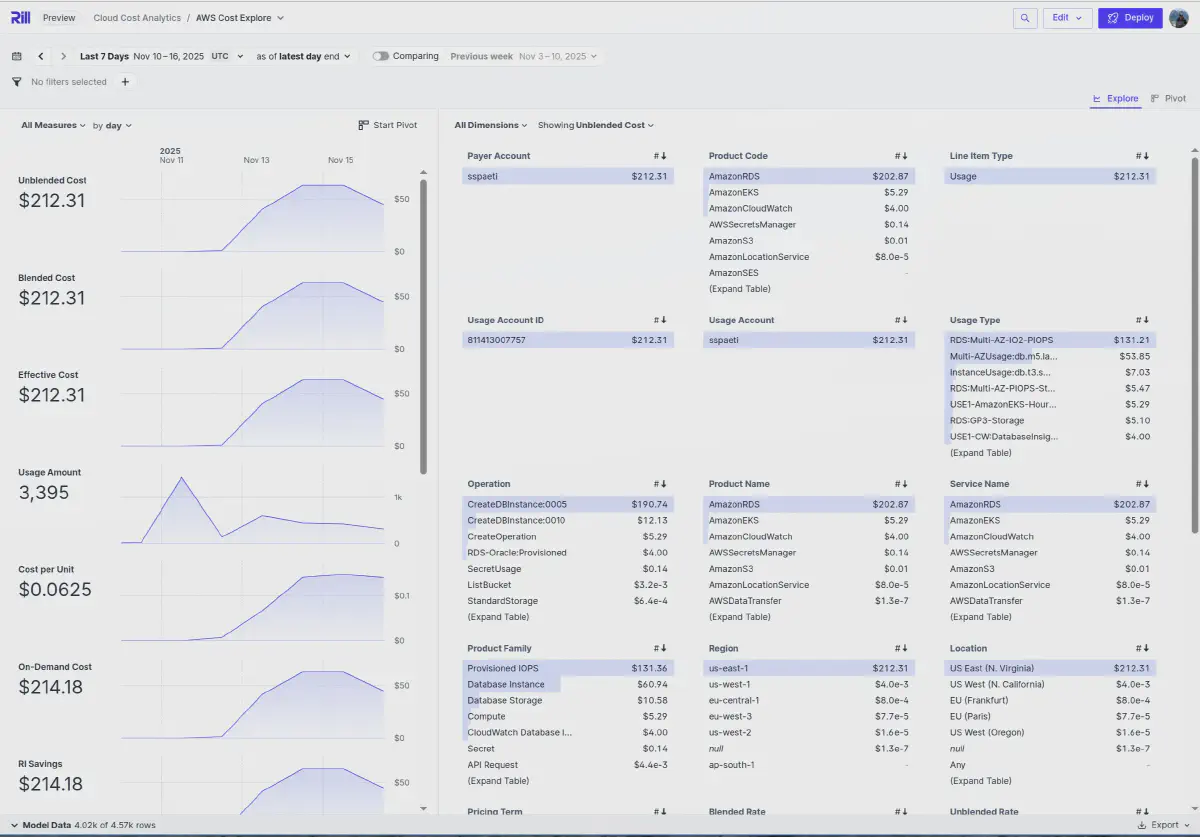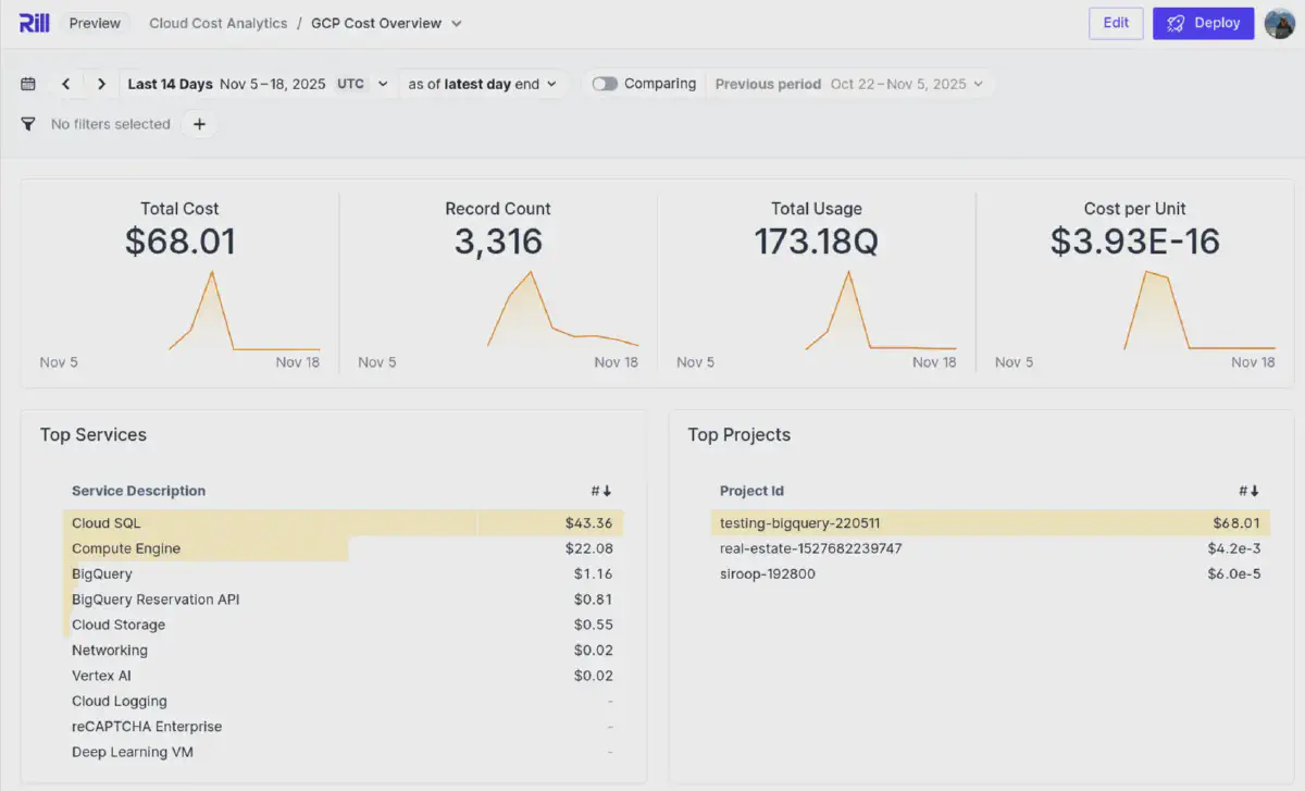 - Rill is a super fast UI with quick filtering and aggregation—perfect for debugging cost issues or spotting hidden costs.