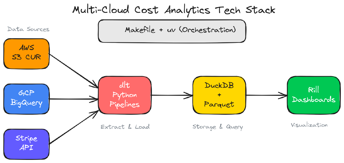 Quickly I knew we would want to use dlt as the integration CLI that speaks Python, super lightweight and integratable everywhere through a CLI. We wanted to store the data in DuckDB locally or ClickHouse in the cloud and visualize with Rill, including the pre-created dashboard by aws-cur-wizard.